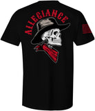 Looking for a shirt that will show your patriotic side? Look no further than the Allegiance Cowboy Tee! The Cowboy tee features a skeleton head wearing a cowboy hat and bandana screen printed small on the front and big on the back, with an American Flag printed on the sleeve. It's available in black and white, and is made of 100% cotton. It's machine washable, made in the USA, and perfect for any season. With a relaxed fit, you'll be comfortable no matter what you're doing. Show your allegiance to the USA with this stylish tee today!