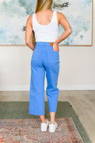 Slip into style and comfort with our Lisa High Rise Control Top Crop Jeans from Judy Blue. Featuring tummy control technology and 4-way stretch, these jeans provide a flattering fit. The wide leg crop and raw hem add trendy details, while the fun sky blue color will brighten up any outfit. Garment dyed for lasting color.