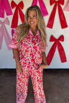 Our Luxe PJ Lounge sets are the perfect sleep set for both comfort and style. Features a button-up top with short sleeves and matching PANTS, with cute new designs that will keep you looking good while you relax. The fabric is ultra-soft, STRETCHY and lightweight for a relaxed feel. Pants have pockets and elastic waist. Feature contrast fabric on trim and collar for an extra "luxe" feel.