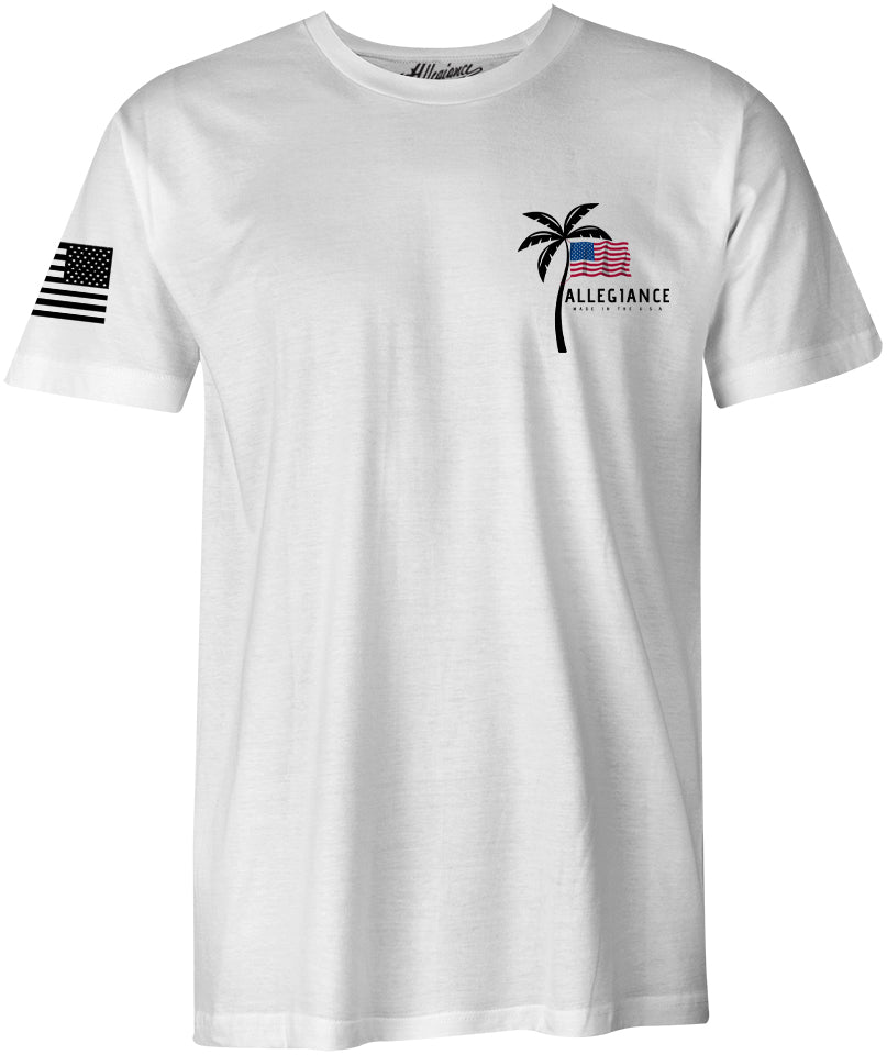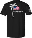 Stand out in the Allegiance Vibe Tee! This tee features the Palm Tree logo screen printed small on the front, big on the back, and an assaulting American Flag printed on the sleeve
